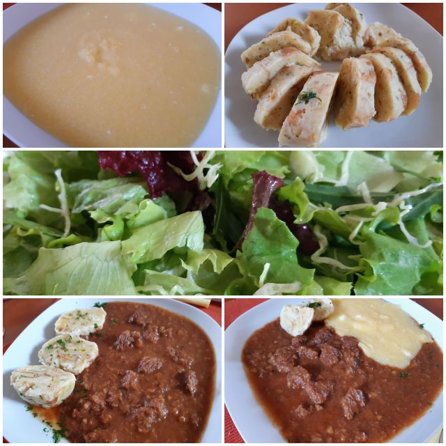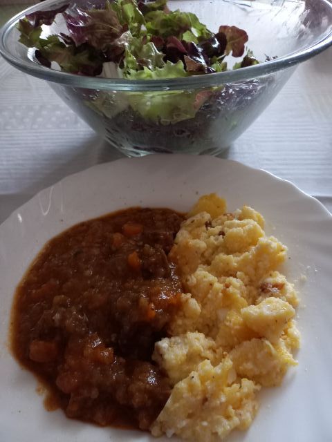 Goveja juhica (iz zaloge), goveji golaž (od včeraj), polenta z ocvirki in slanim sirom; "rjava" solata