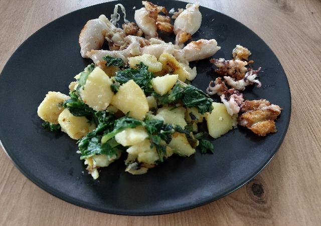 - polnjeni lignji s prekajeno šunko in sirom ter blitva s krompirjem: