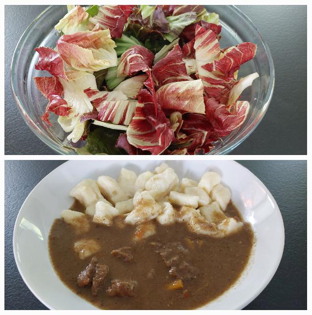 - golaž iz zaloge, domači njoki in skleda domačega radiča s krompirjem:
