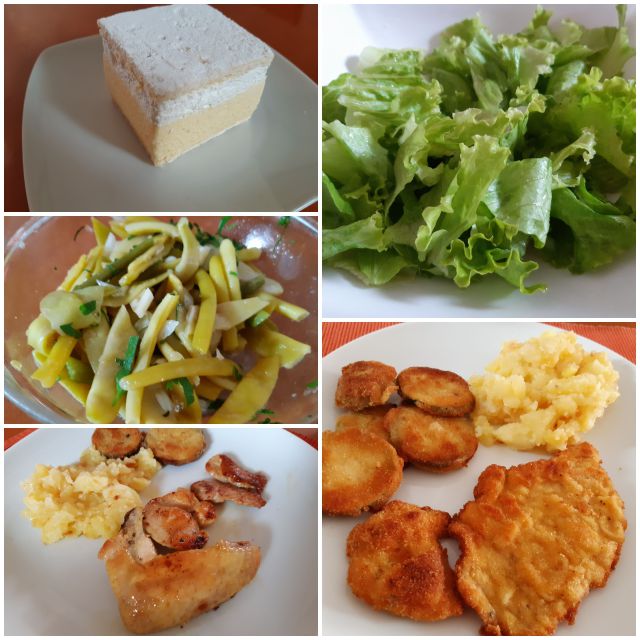 Danes meso po dunajsko, panirane domače bučke, pražen krompir, domači solati ( stročji fižol in zelena solata), kremšnita