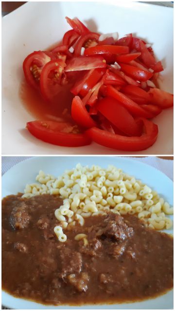 Včeraj golaž, polžki testenine, paradižnikova solata.