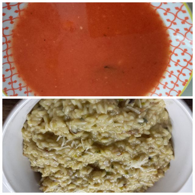 Paradižnikova juhica z rizoni; gobova rižota