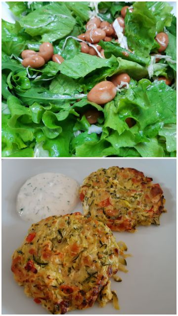 Včeraj bučkini polpeti, jogurtova omaka z zelišči, zelena solata s fižolom