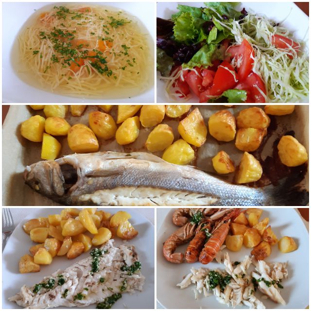 Danes goveja juha z rezanci, brancina, škampi, pečen krompir, mešana solata