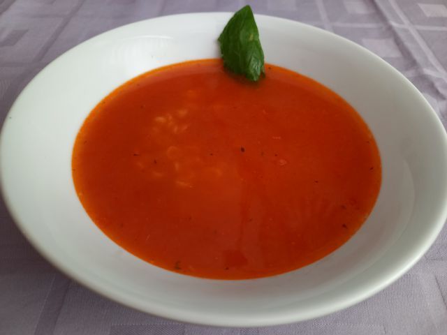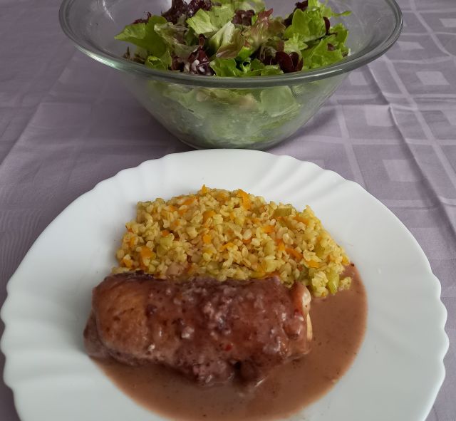 Paradižnikova juhica; bulgur na poru in korenčku, nadevan puranji zrezek v črnem vinu; zeleno/rjava solata