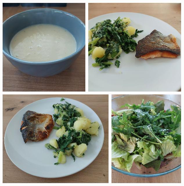 Juha z gomoljne zelene, pečen losos, krompir z blitvo in mešana solata z vrta: