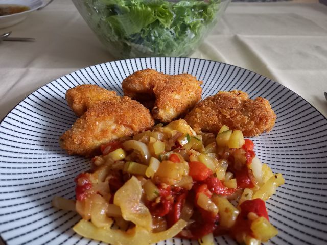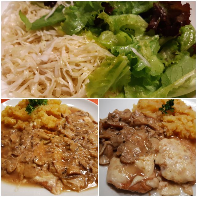 zrezki s sirom in orehi z jurčkovo omako, pražen krompir, solata