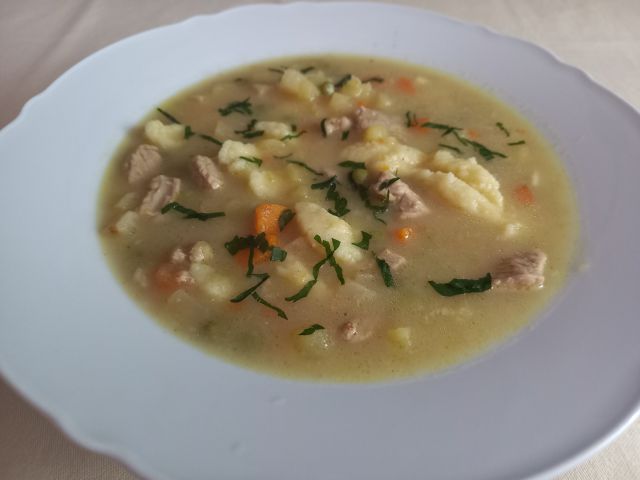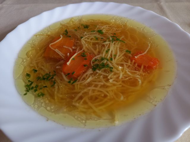 Kostna juhica; panirane perutničke, bučke in paprika iz voka; skutno-jabolčni zavitek