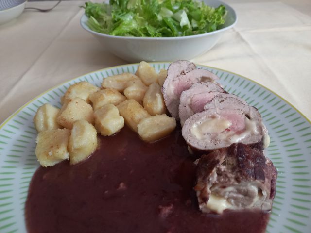 Juhica (od včeraj), sv.file nadevan s sirom, v črnem vinu, njoki; zelena solata
