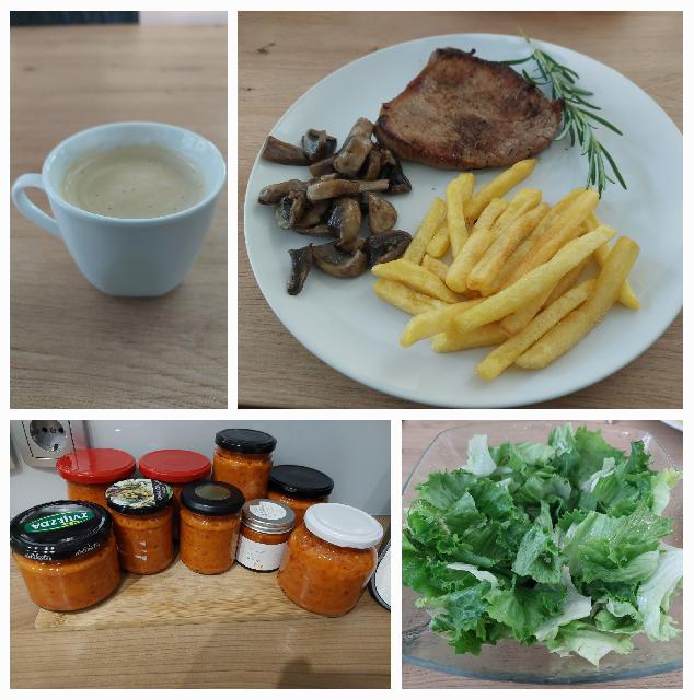 - zrezek, pomfri, popečeni šampinjoni, zelena solata, espresso in prva runda ajverja s pečenimi paprikami: