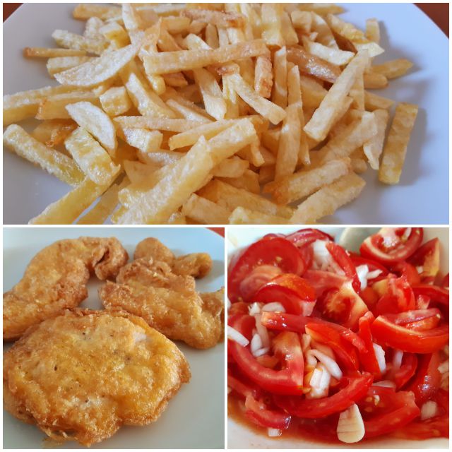Pariški zrezki ( puranji, svinjski), pomfri, paradižnikova solata