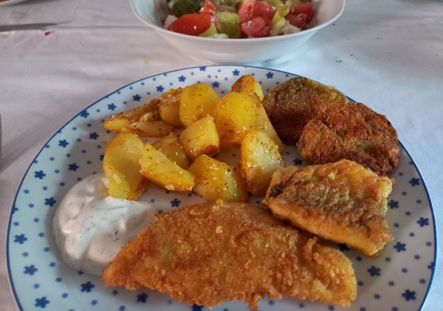 Paniran oslič, piščančji file, malancani, pečen krompir; grška solata; veliko limonade