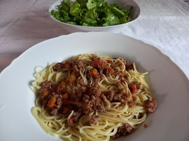 Špageti a`la bologneze; zelena solata