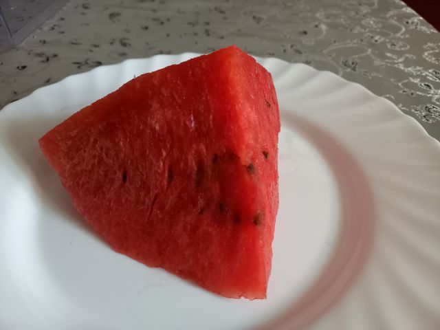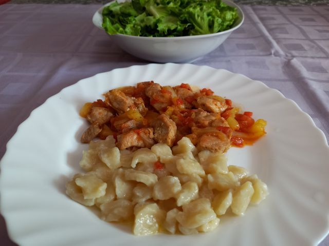 Praženo meso s čebulo, papriko in paradižnikom, ščipanci na maslu; zelena solata; lubenica