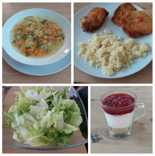 - poletna zelenjavna juha, pečena pišč. bedra, bučkini polpeti s papriko, kus-kus, zelena solata in cheesecake z malinami v kožarčku: