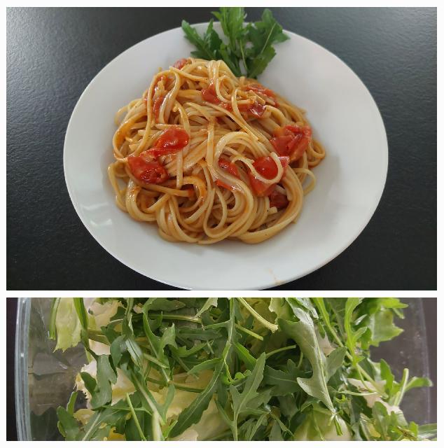 - mešana solata in bavettine z omako iz češnjevcev, česen, parmezan, bazilika, ol. in čili olje - vrhunski