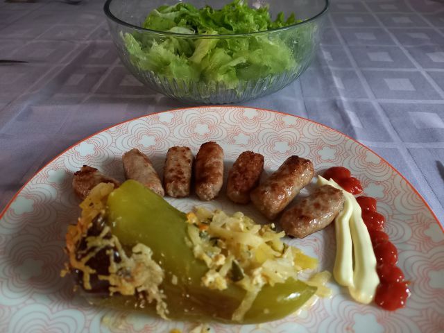 Paprika polnjena s krompirjem, čevapčiči; zelena solata