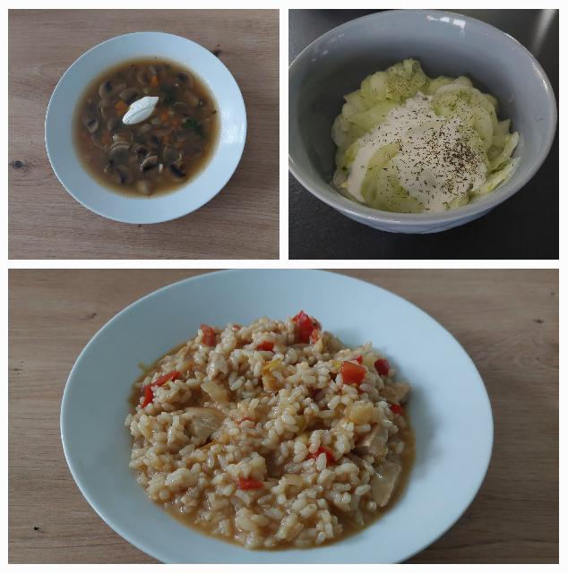 - gobova juha, piščančja rižota, kumarična solata z jogurtovim prelivom: