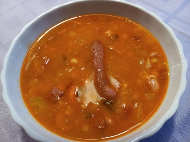Enolončnica z mladim fižolom, zraven en štiklec kratke klobasičke; pehtranova potička se še peče