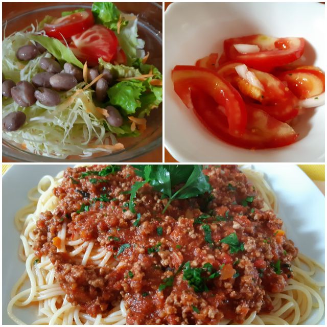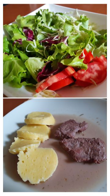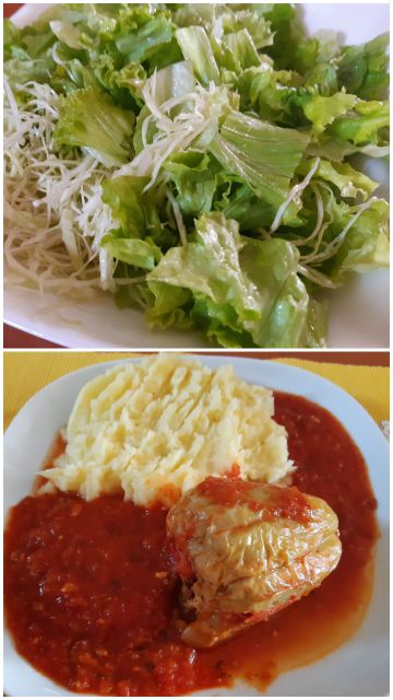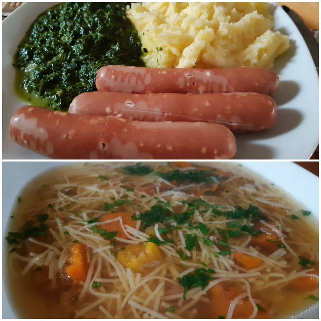 Nedelja: bučna juha, mesni polpeti, pire,pohane bučke, zelena solata s paradižnikom, še ostanek kremšnit od včeraj
