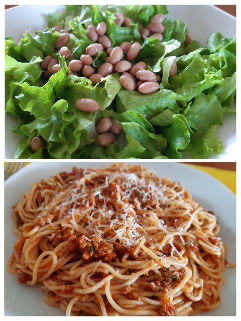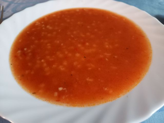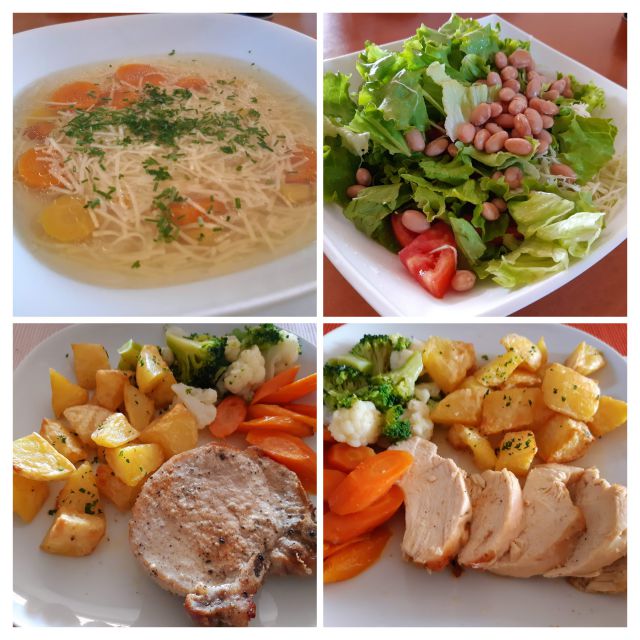 Sobota zelenjavna juha, špinačni tortelini v paradižnikovi omaki z dodatkom pancete, kumare v solati, kremšnite iz slaščičarne
