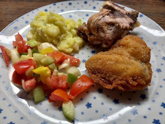 Paradižnikova juhica, ostanki od včeraj - krompirjeva in šobska solata, pohano, odojček