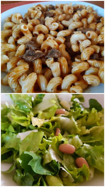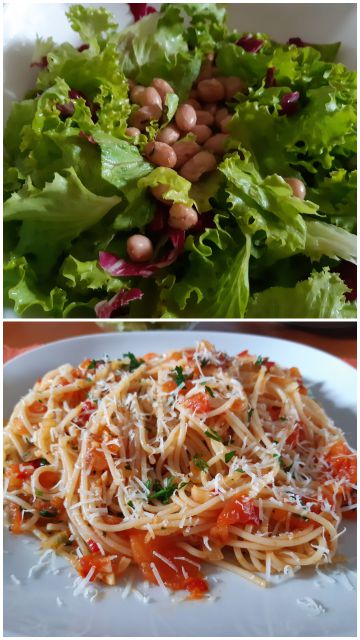 Včeraj špageti s paradižnikom, čilijem in česnom, solata.