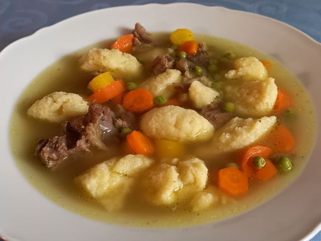 Fuser, skuhala juhico iz govejega repa, dva večja kosa, dodala sem neobrano kost in dosti zelenjave. Počasi se kuhalo 4 ure. Par šefl juhice sem dala v drugo posodo, dodala pest graha in v to zakuhala knedlčke. Potem sem rep "oglodala", korenček narezala ter dodala v posodo.