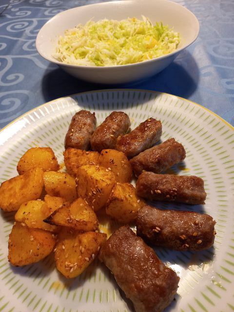 Goveja juhica (od včeraj); pečeni čevapčiči s krompirjem; zeljnata solata; brzinsko pecivo