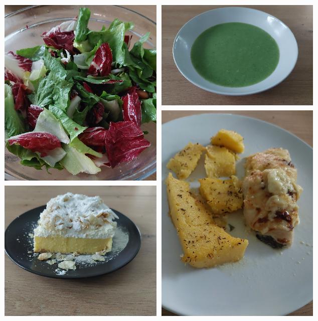 -juha oz kopriv, piščančje rolade z zeliščnim sirom in blitvo, popečena polenta, solata, kremšnite