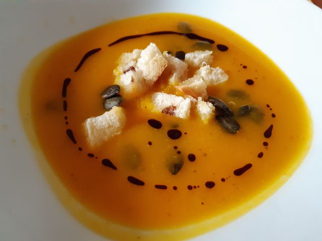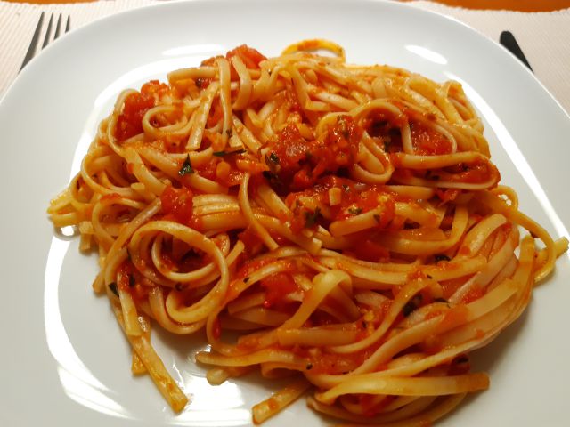 Danes bučna juha, testenine s čilijem, česnom, paradižnikom in parmezanom, zelena solata