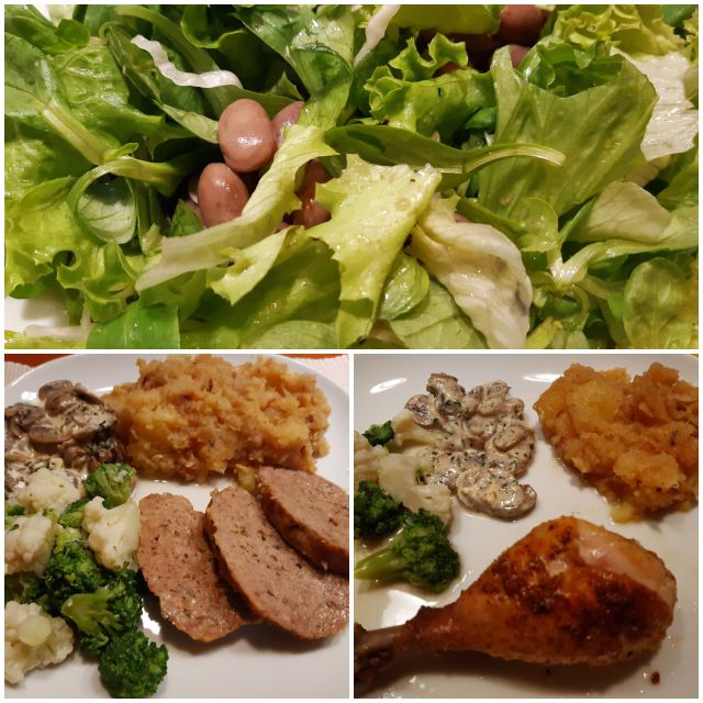 Danes stefani pečenka, piščančji kosi, pražen krompir, brokoli/cvetača, šampinjoni v omaki, solata