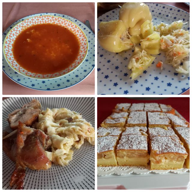 Paradižnikova juhica; puran z mlinci; zelje v papriki; pudingovo-jabolčno pecivo