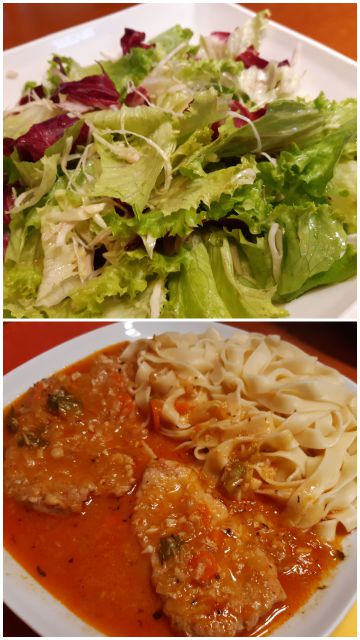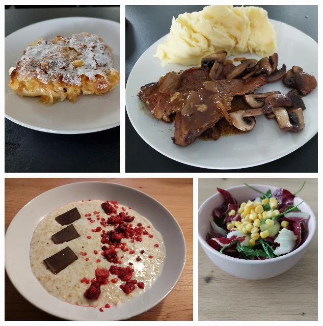 Goveja pečenka, pire, popečeni rjavi šampinjoni, omaka od pečenke, radič, rukola in motovilec v solati, jabolčni zavitek s skuto. Za večerjo pa ovsen kaša z malinami in čokolado.