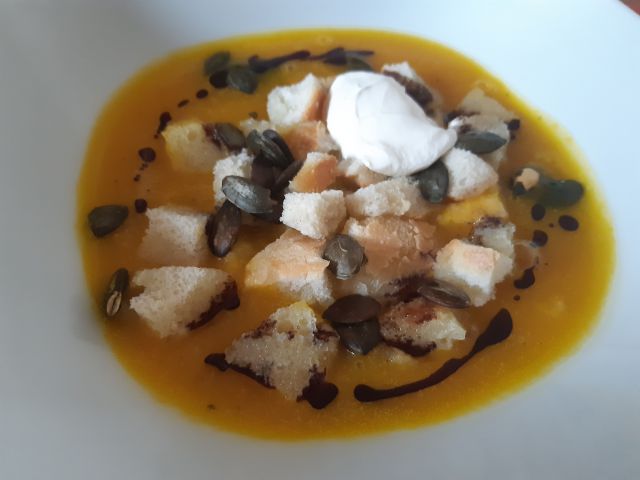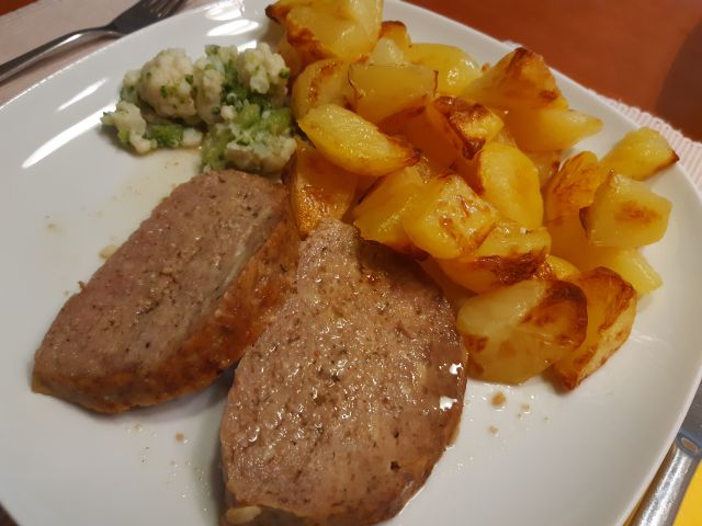 Danes skoraj identično kosilo kot v sredo. Ostanek bučne juhe, ostanek stefani pečenke, pečen krompir, paradižnik Lušt v solati.