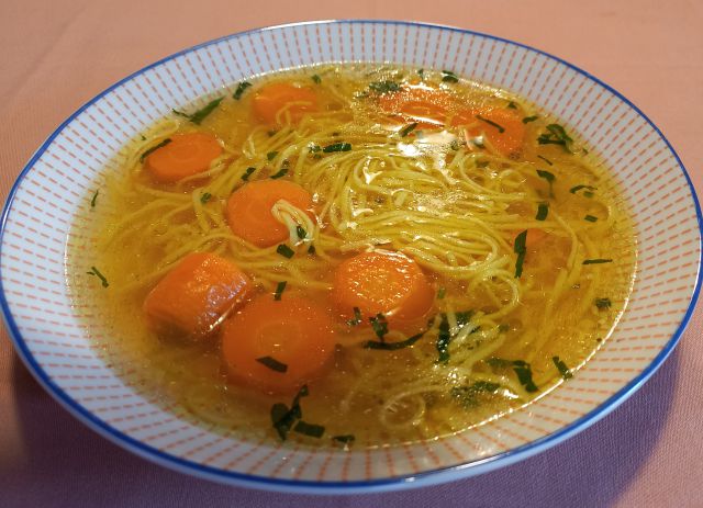 Danes goveja juha z rezanci,  govedina,  pražen krompir,  solata, kava