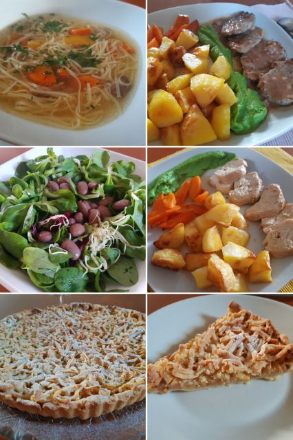 Za vikend smo bili veliko zunaj v naravi in precej prehodili. Zjutraj sem naredila testo za pito (juho sem skuhala včeraj). Kuhati sem začela po dolgi poti nazaj...najprej sem spekla jabolčno pito, goveja juha z rezanci, pečena piščančja prsa, svinjska ribica, pečen krompir, brokolijeva omaka, motovilec s fižolom.