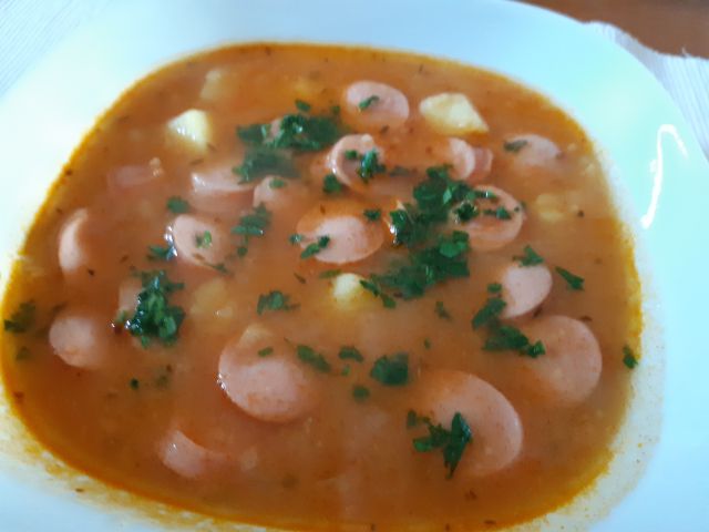 Včeraj krompirjev golaž s hrenovkami, kruh in jabolčna pita.