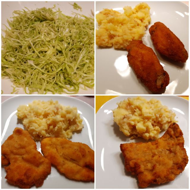 Meso po dunajsko ( piščančje, svinjsko), pražen krompir, zeljna solata..
