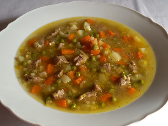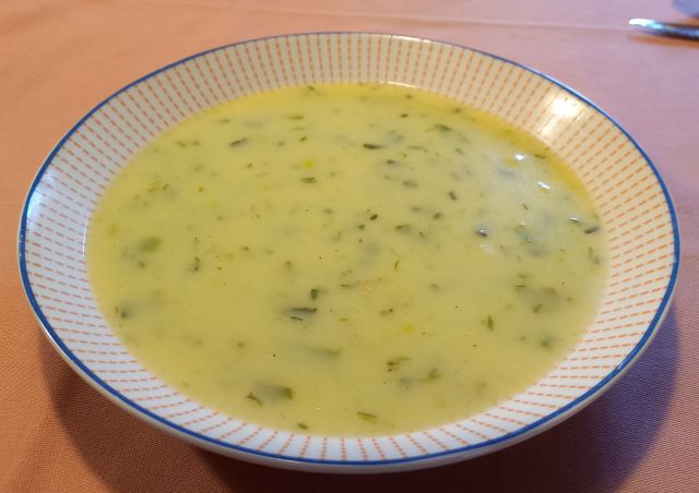 Kremna porova juhica; vratovina v vinski omaki, rizi-bizi; štrucar s krompirjem