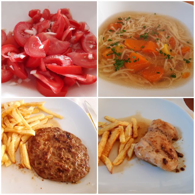 Včeraj goveja juha z rezanci, pečeno bedro brez kosti, domače pleskavice, pomfrit, paradižnikova solata