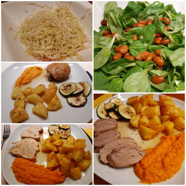 Danes- pečena sv.ribica, piščančje prsi, zg.del bedre, pečen krompir, popečene bučke, korenčkova omaka, motovilec s fižolom in zeljna solata