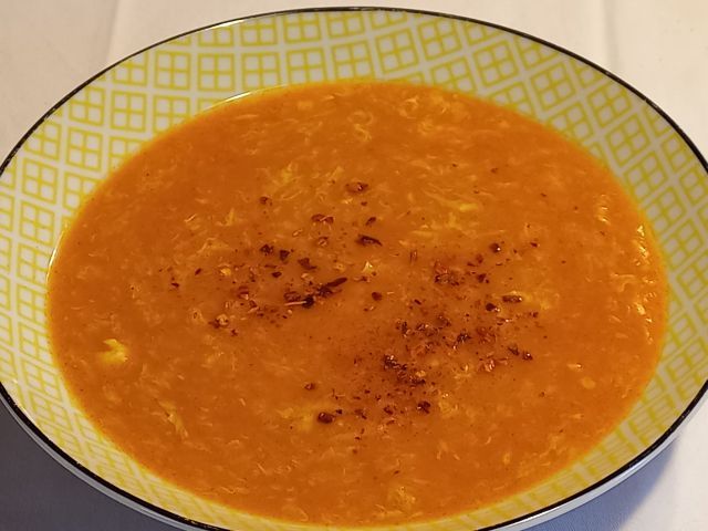 Včeraj, gobova juha, pečen file postrvi, kus kus z bučkami, solata, krof