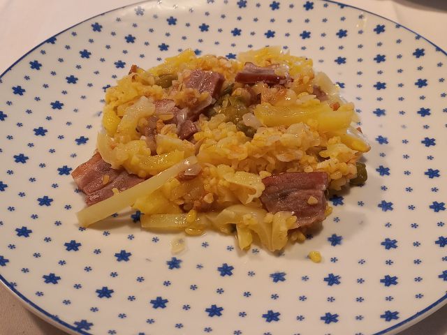Prežganka; slanina na čebuli, paprika in bulgur z vinom
