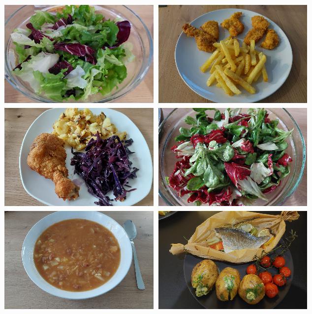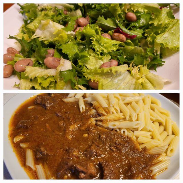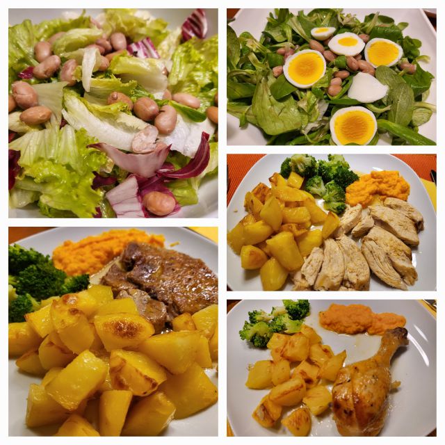 Včeraj pečeno meso, krompir, brokoli, korenčkova omaka, solati