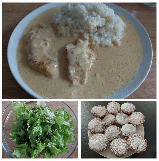 - pišč.zrezki v parmezanovo-limonini omaki 👌👌👌, riž, solata, mufini malina-robida: