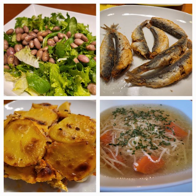 Včeraj goveja juha, preostanek musake, zame sardine, solata