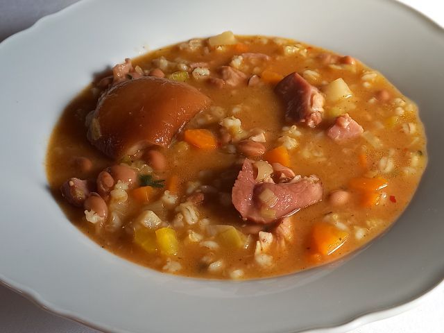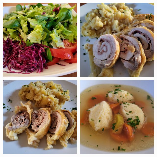 Danes goveja juha z zdrobovimi cmoki, roladici v testu, pražen krompir, solata