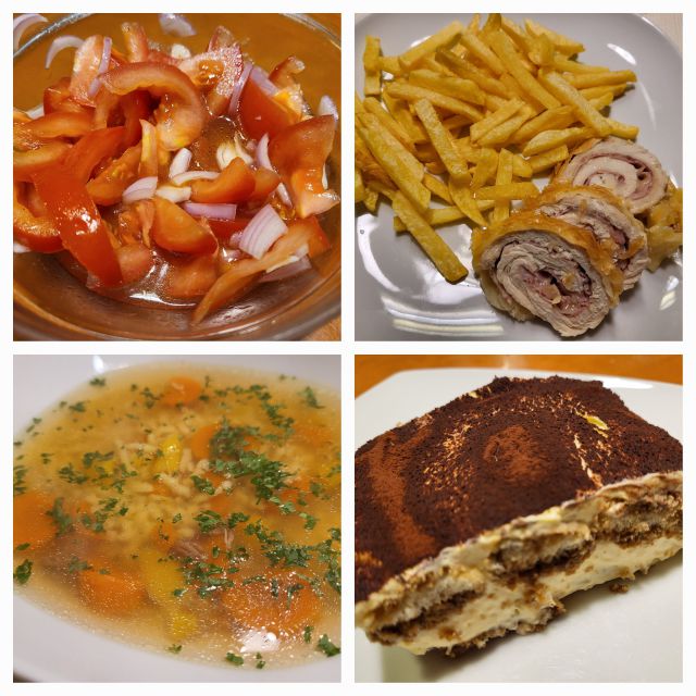 Včeraj goveja juha z ribano kašo, ostanek pečenke, pomfri, paradižnikova solata, tiramisu
