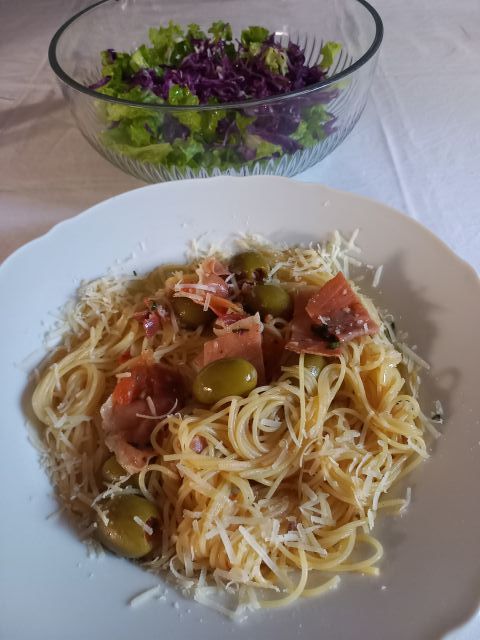 Špageti na česnu in pršutu; zelena solata z rdečim zeljem